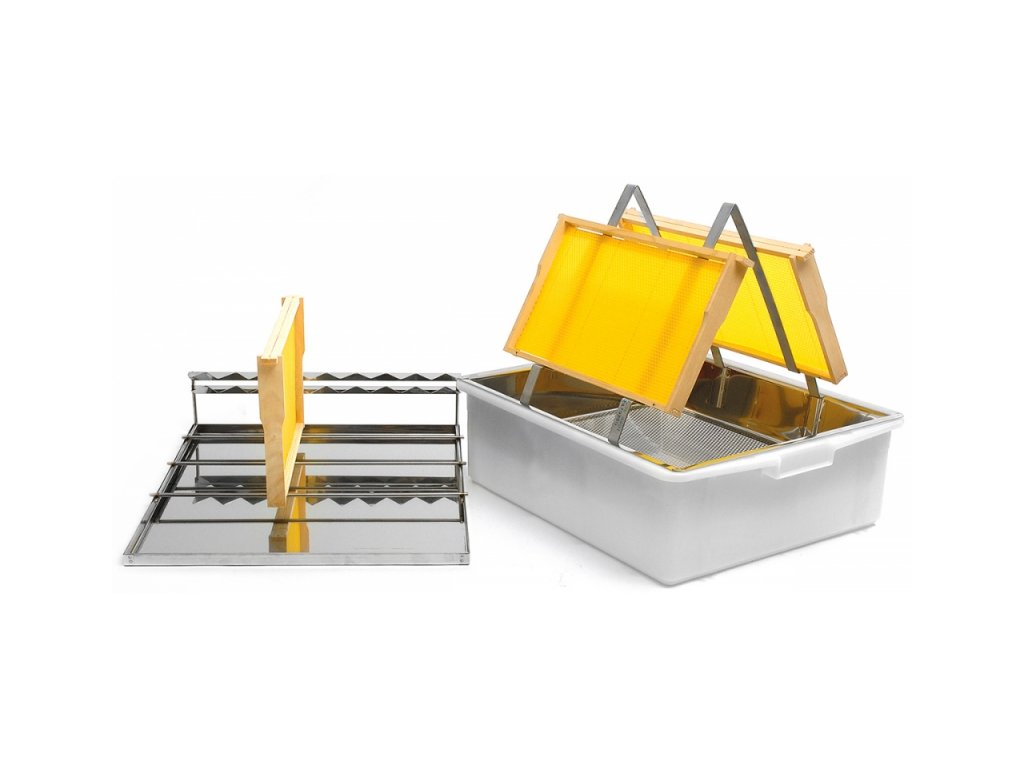Odvíčkovací talíř slouží k tomu, aby na něm mohli současně odvíčkovávat dva pracovníci. Do děrované vany zasadíte přibalené nohy, na které si plástve postavíte a můžete odvíčkovávat.
